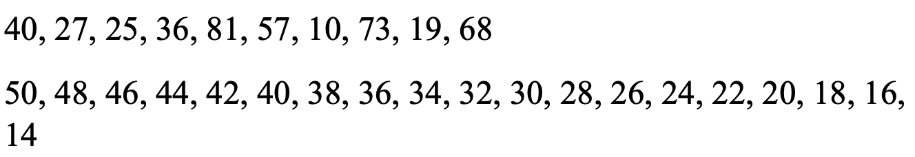* 위 두 개의 sequence를 완벽하게 외워야 된다고 생각해보자. 얼핏 보기엔 첫 번째 sequence가 더 짧기 때문에 더 외우기 쉬울 것으로 보인다. 하지만 자세히 들여다보면, 두 번째 sequence는 50부터 2씩 14까지 줄어드는 pattern을 가지고 있기 때문에 오히려 두 번째 sequence가 더 외우기 쉬울 것이다.