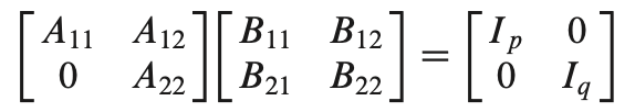 * 만약 matrix A의 inverse marix가 B라면 아래와 같이 쓸 수 있다. 우변의 matrix는 (p+q) x (p+q) 크기의 Identity matrix이다.