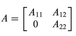 * 이 때 matrix A를 block upper triangular 라고 한다. 만약 $A_{12}$가 0이라면 block diagonal matrix라고 부른다.