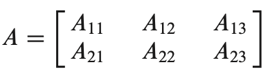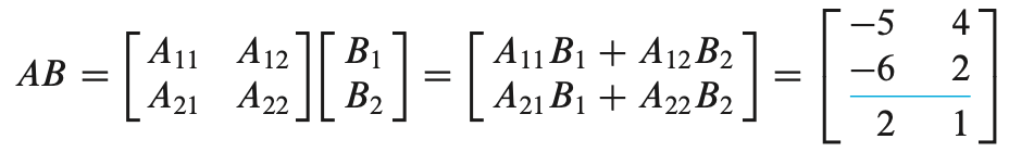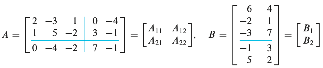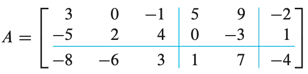 * 위와 같이 matrix를 여러 개의 sub matrix로 표현한 것을 partitioned matrix 혹은 block matrix라고 부른다.