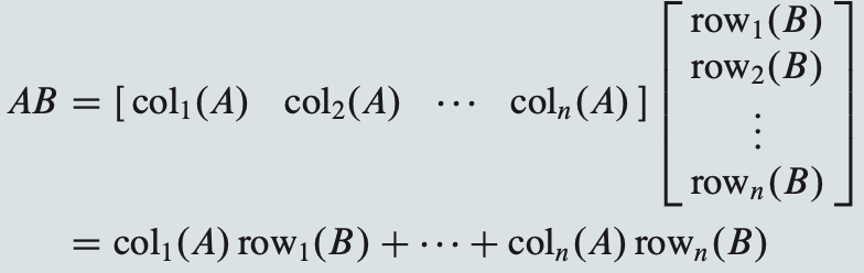 * 위 $col_1(A), col_2(A), ... , col_n(A)$과 $row_1(B), row_2(B), ... , row_n(B)$는 각각 1개 단위로 column을 나눈 partition들, 1개 단위로 row를 나눈 partition들을 의미한다. A, B matrix를 이와 같이 partition된 matrix라고 본다면 두 matrix간의 곱은 위 결과와 같이 계산할 수 있게 된다.