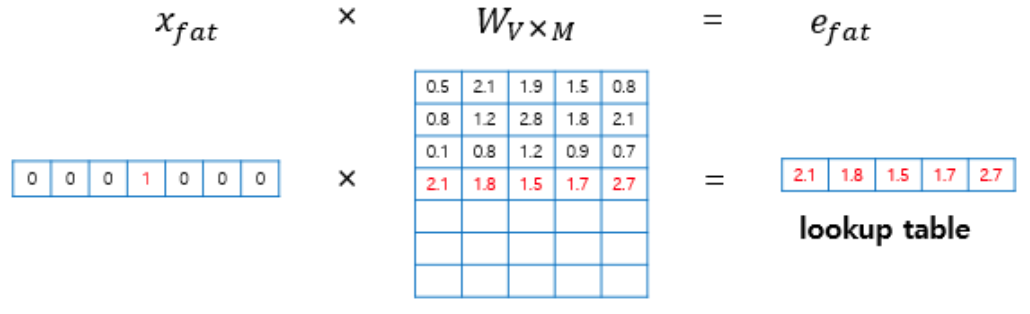* Dense Representation은 sparse vector를 더 작은 차원의 vector(=Dense Vector)로 변환하는 방법을 뜻한다. 위에서 설명했듯이 10,000차원의 sparse vector(one-hot vector)가 있다면, 이를 사용자가 설정한 차원의 vector로 변환한다. NNLM 포스팅에서 설명했듯이 lookup table이라는 weight matrix를 곱함으로서 사용자가 설정한 차원의 vector로 변환될 수 있다. 참고를 위해 NNLM 포스팅에서 살펴봤던 위 자료를 보자.