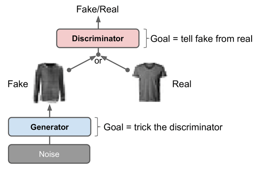 * 훈련 동안 discriminator는 fake, real image를 구분하는 것을 목표로, generator는 dicriminator를 속여 real image라고 믿게 만드는 것을 목표로 한다. 하지만, 이렇게 정 반대의 목표를 가지고 훈련을 진행하게 되면 dicriminator, generator 모두 제대로 된 학습을 하기 어려울 것이다. 때문에 훈련은 두 가지 단계로 구분되어 진행되고 각 단계마다 dicriminator의 가중치, generator의 가중치 중 하나만 update하게 된다.