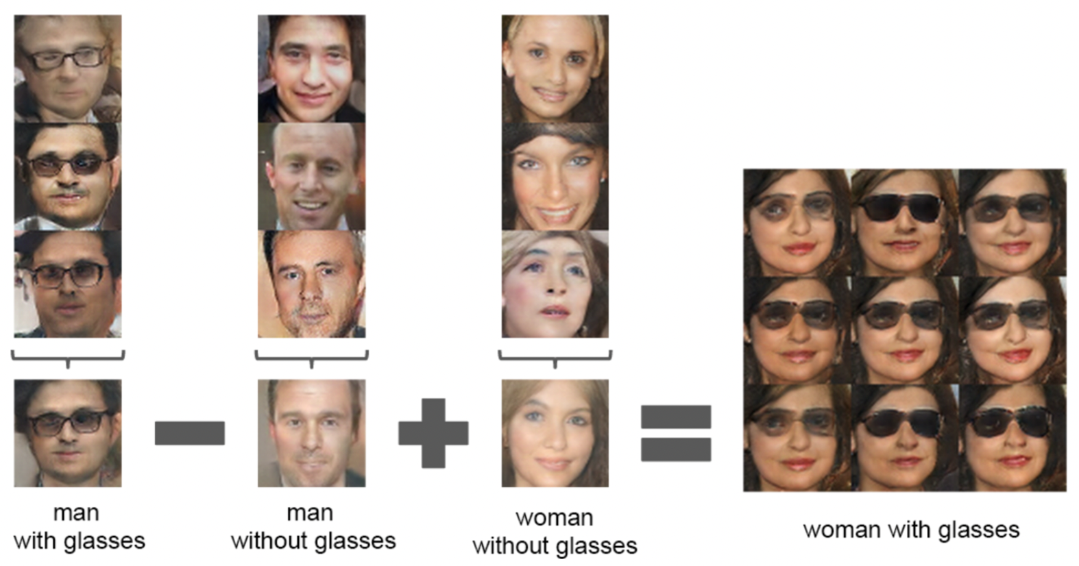* DCGAN을 이용하면 위와 같이 이미지의 평균 벡터를 통해 마치 이미지 자체를 연산하는 것과 같은 효과를 낼 수 있다.