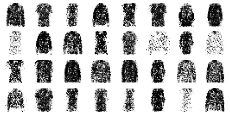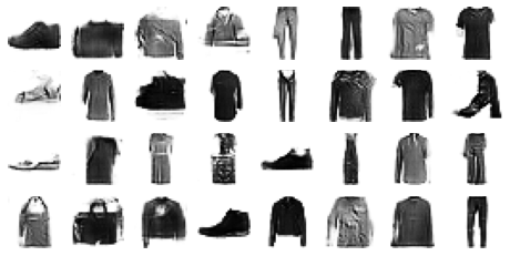 * X train을 reshape해준 후에 사용자 정의 반복 훈련 함수인 train_gan()을 사용하여 훈련을 진행하였다.