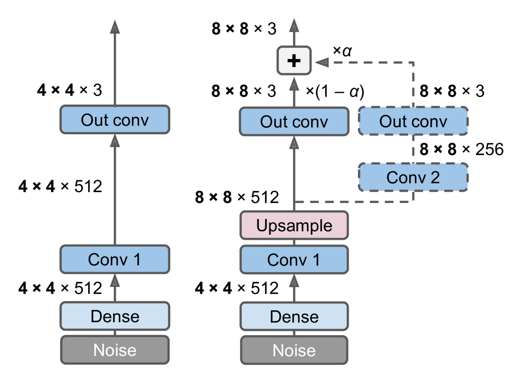 * 왼쪽이 4 x 4 컬러 이미지(color dimension : 3) 를 생성하는 generator라면, 오른쪽은 이를 확장시켜 8 x 8 컬러 이미지를 생성하는 generator이다. 기존 generator의 convolution layer 1 다음으로 upsampling layer를 추가해 8 x 8 feature map을 출력한다.(keras 구현시 UpSampling2D layer의 interpolation 파라미터 'nearest'설정)
