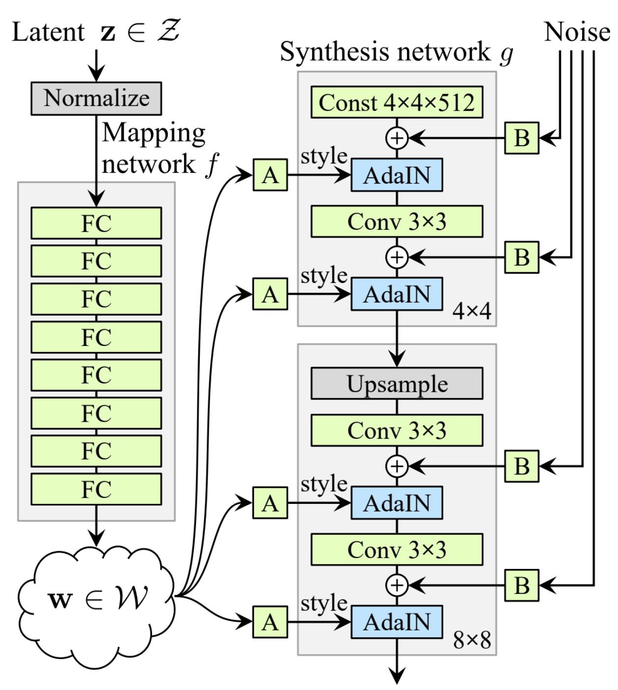 8개의 MLP가 latent representation을 vector w로 매핑한다. 이 벡터는 여러 affine transformation으로 전달되어(A로 표시된 activation function이 없는 Dense layer) vector 여러개를 생성하게 된다. 이 과정은 mapping network가 coding을 여러 style vector로 매핑하는 것을 뜻한다.