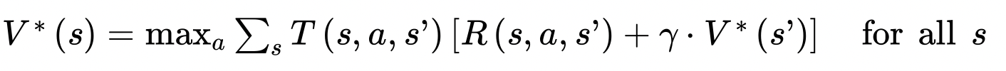 * bellman은 상태 s의 최적의 state value $V*(s)$를 추정하는 방법을 찾았다. 이 값은 agent가 상태 s에 도달한 후 최적으로 행동한다고 가정했을 때 평균적으로 기대되는 할인된 미래 보상의 합이다.