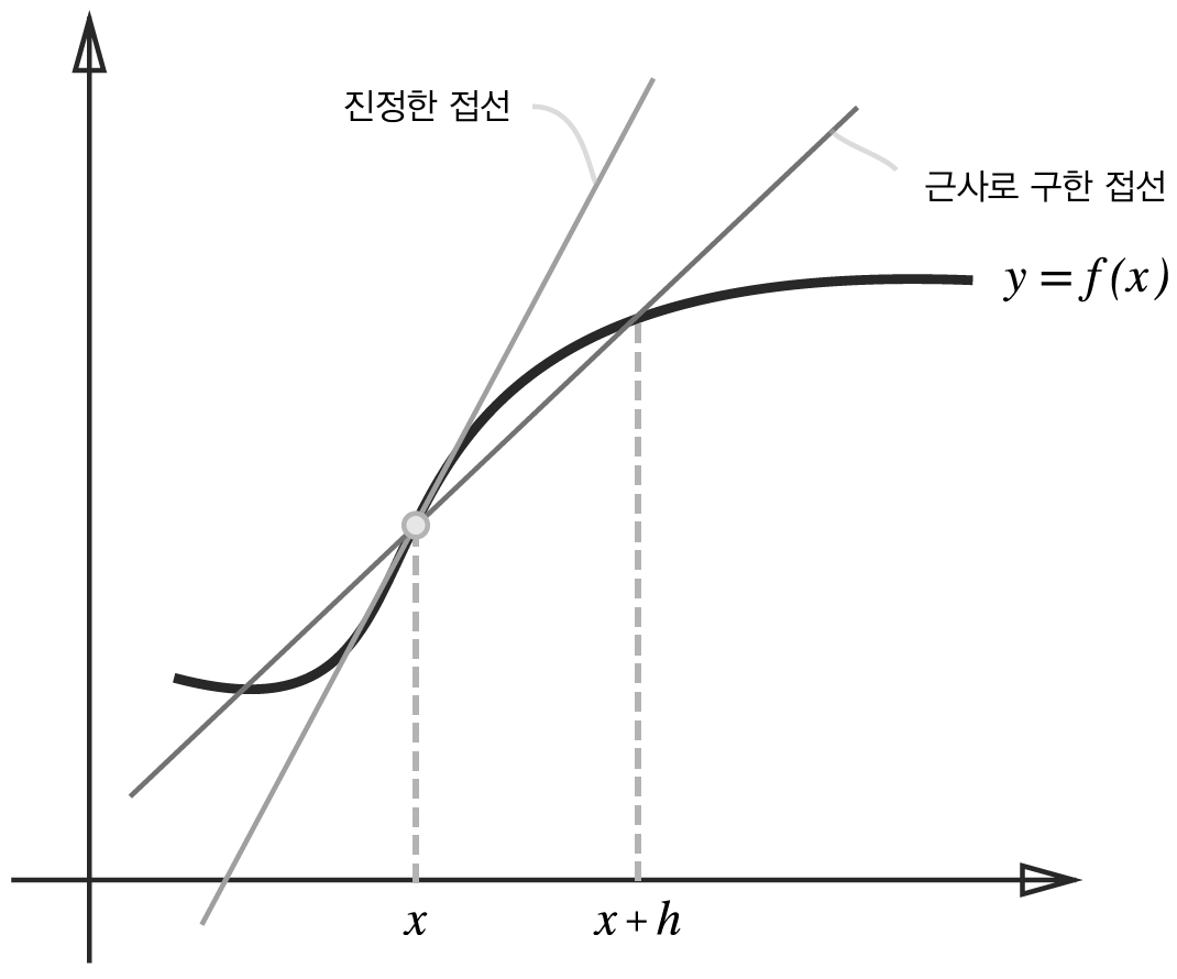 2) 위 수식은 h가 0에 한 없이 가까워질 경우를 가정한다. 하지만, 실제로 우리는 h를 0에 한없이 가까운 값으로 설정할 수가 없다. 때문에 $10^{-4}$와 같이 h가 0에 한없이 가까울 때와 비교했을 때 훨씬 큰 값을 사용하게 되는데, 이 때문에 해석적으로 미분한 결과인 기울기와 실제로 우리가 근사적으로 구할 수 있는, 수치적으로 구한 기울기는 차이가 발생한다.