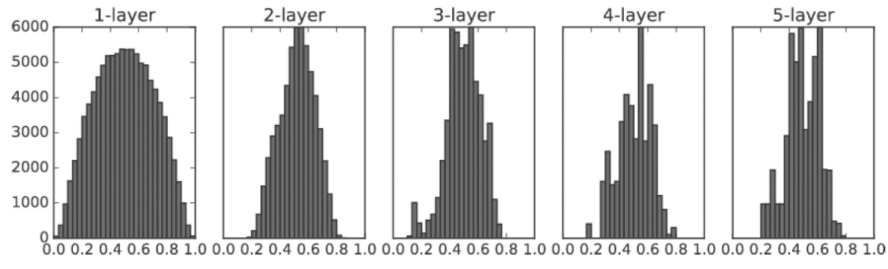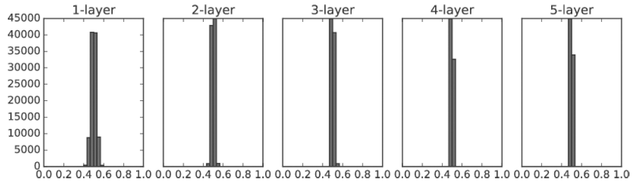 * 확인해보니 0.5에 활성화 값이 몰려있다. 이 경우도 곤란한데 다수의 뉴런이 거의 같은 값을 출력해 표현력을 제한한다는 문제가 있기 때문이다. 다시 말해 뉴런이 여러 개 존재하는 의미가 없어지는 것이다.