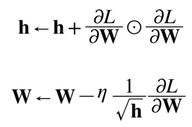 * 기존 SGD에서 변수 h가 추가되었다. h는 학습률을 조정하는 parameter로서 가중치의 기울기를 제곱하여 계속적으로 더해주게 된다. 가중치 W를 update하는 과정에서 ${1 \over \sqrt{h}}$를 곱해주게 되는데 이 과정에서 기울기가 큰, 다시말해 크게 갱신되는 원소는 학습률이 더 작아지게 된다. 이를 통해 각 매개변수에 맞춤형 learning rate이 적용된다.