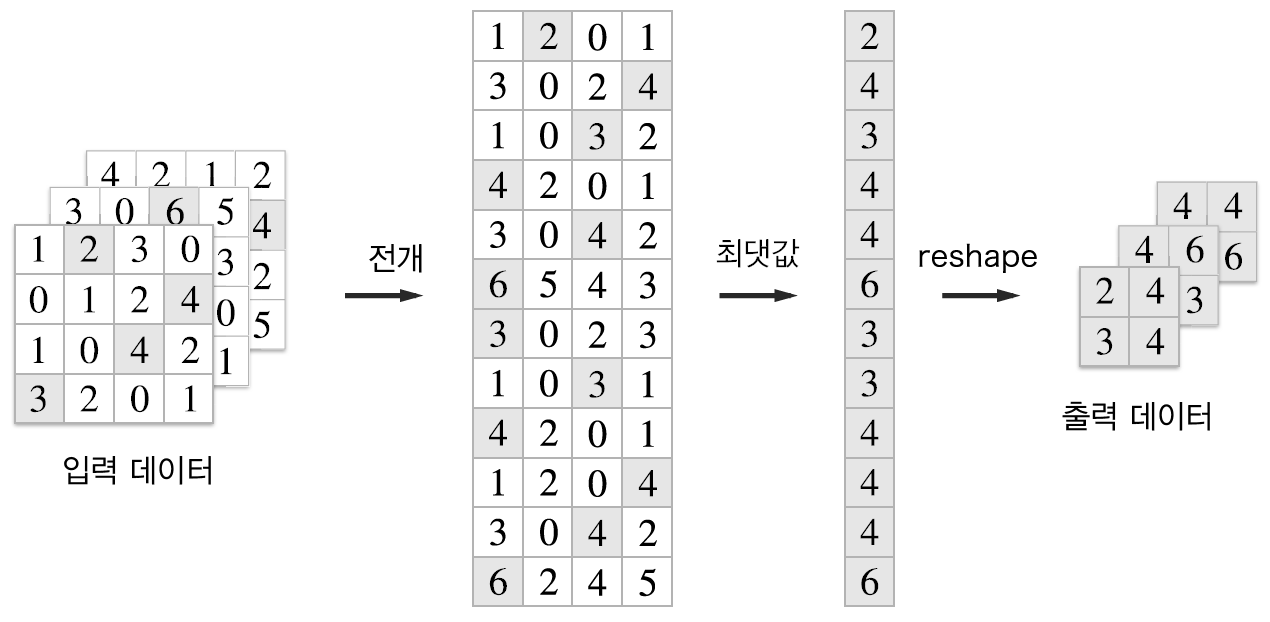 * pooling layer는 세로, 가로 방향의 공간을 줄이는 연산을 뜻한다.