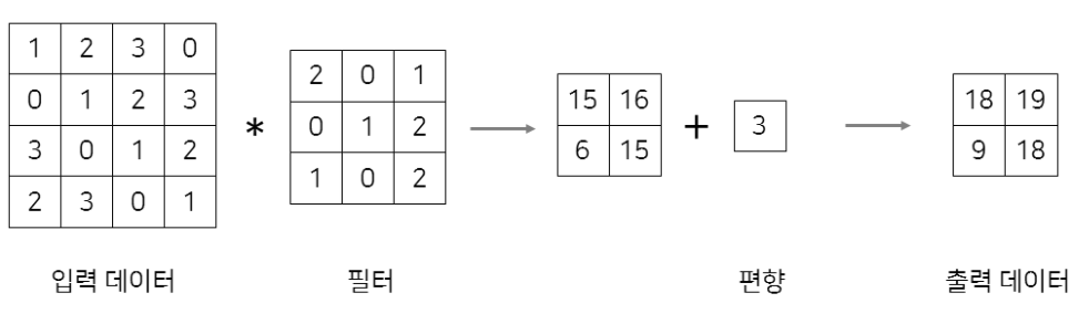 * 완전연결신경망에서 매개변수는 가중치와 편향으로 이뤄져있었다. CNN에서의 가중치는 필터의 값들이 가중치가 되고, 편향은 1x1의 단일 값으로 FMA 이후 출력된 feature map의 모든 원소에 더해진다.