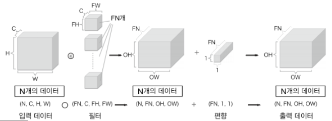 * CNN에서도 배치 처리가 가능하다. 위와 같이 (C, H, W) 크기의 데이터 N개를 한 번에 계산하는 것이 가능하다.
