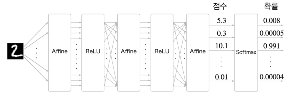 * 그리고 이 완전연결층을 구현할 때 우리는 지금까지 Affine layer와 ReLU layer를 사용하였다. 이렇게 말이다.