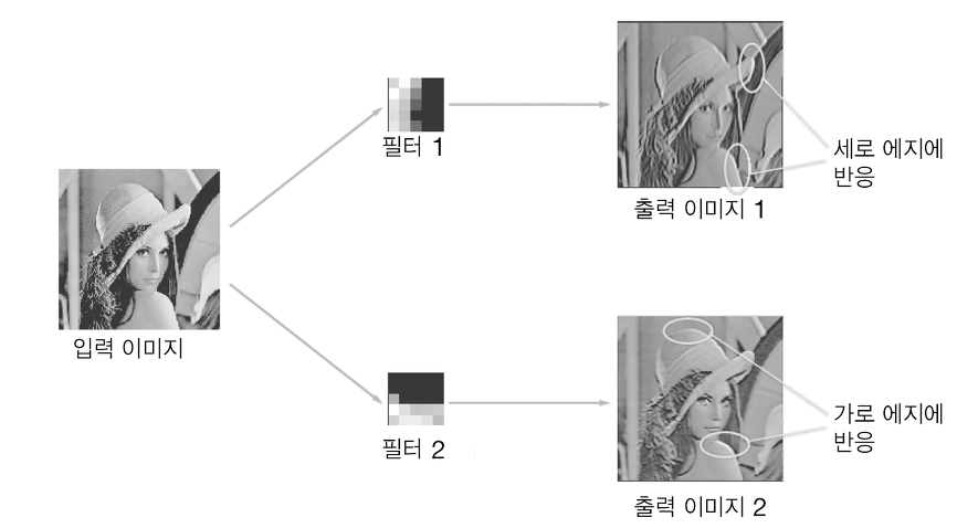 * filter의 모양에 따라 다르지만 대표적으로 세로 edge를 detect하는 filter 1과 가로 edge를 detect하는 filter2를 보자. filter1의 왼쪽 부분에 세로로 길게 이어진 흰색 픽셀이 보이는 것을 알 수 있는데, 이 때문에 filter1과 곱해진 원본 이미지는 세로 edge에 흰 픽셀이 많이 나타나게 된다. 반대로 filter 2의 출력본에서는 가로 edge에 흰 픽셀이 많이 나타나는 것을 확인할 수 있다.