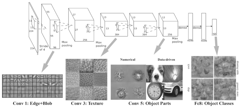 * 앞서 저수준의 layer에서 어떤 정보를 추출하는지 시각화를 해 보았다. 그렇다면 깊이가 깊어질수록 어떤 정보를 추출하게 될까? 위 네트워크는 AlexNet이고 밑에 있는 그림들은 각 layer에서 어떤 feature map을 추출하는지를 시각화해본 결과이다.