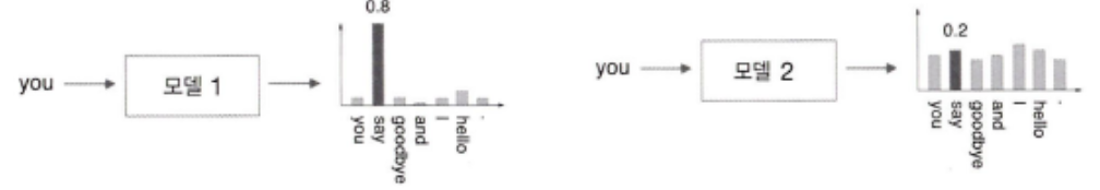 * you가 주어졌을 때 만약 정답이 say라면 모델 1은 say를 0.8의 확률로 예측, 모델 2는 say를 0.2의 확률로 예측했다고 할 수 있다.