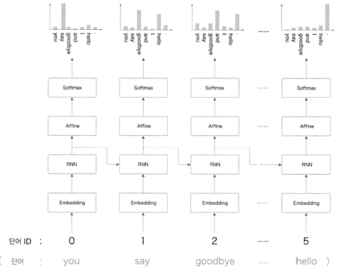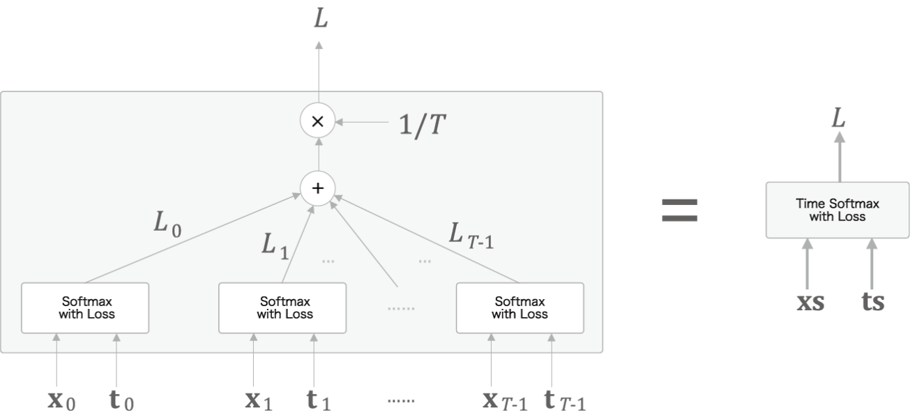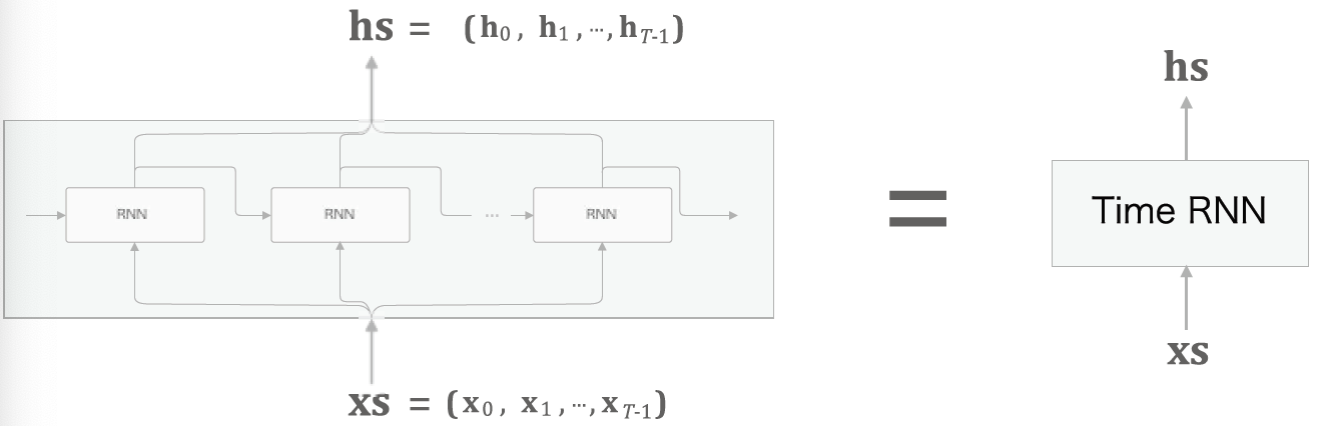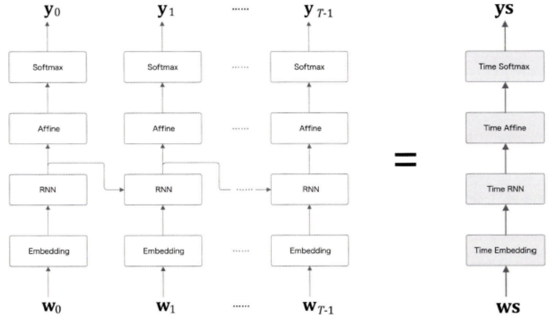 * 일정한 고정 길이의 sequence를 입력 받으면 고정 길이의 sequence를 출력하는 여러 개의 RNN 계층들로 구성된 구조를 time RNN 계층이라고 하자. Time RNN 계층은 공식적인 명칭은 아니며 편의를 위해 임의로 정한 명명규칙이다.