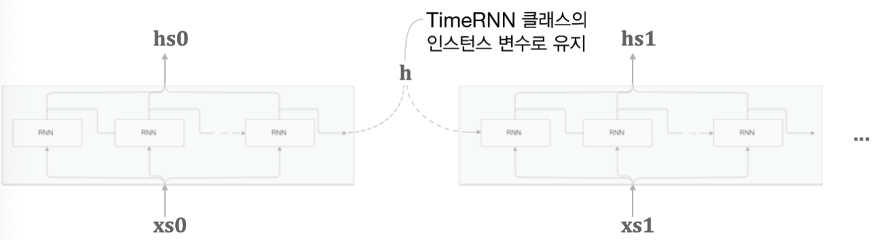 * hidden state h를 인스턴트 변수로 유지해서 RNN 계층이 아니라 Time RNN계층에서 관리하도록 하자. 이를 통해 RNN계층은 hidden state를 다음 time step의 RNN cell에 인계하지 않고 Time RNN 층의 hidden state만 가져다 쓰고 갱신하면 된다.
