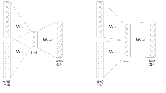 * 오른쪽은 Neural Probabilistic Language Model인데, 은닉층에 따로 context를 입력해 concate하는 방식을 사용하여 순서를 고려하는 것을 볼 수 있다.