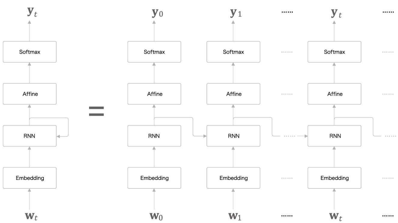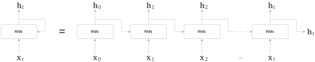 * 순환구조를 시각적으로 보기 편하게 time step에 따라 펼쳐 그리면 오른쪽 과 같다.