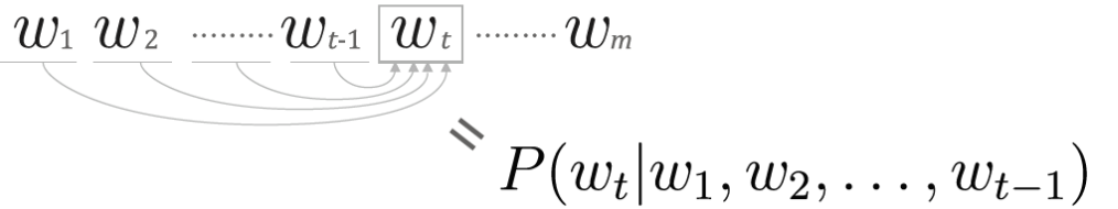 * 이렇게 동시확률 $P(w_1, ... , w_m)$은 사후 확률의 총곱인 $\prod P(w_t | w_1 , ... , w_m)$ 로 표현할 수 있다는 것을 알았다. 그런데 식을 자세히 보면 target의 발생확률은 target의 왼쪽에 있는 모든 단어의 사후확률로 표현되어 있는 것을 알 수 있다. 그림으로 보면 아래와 같다.