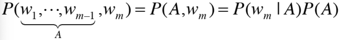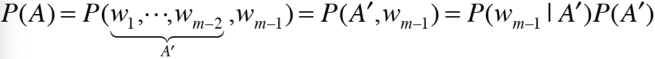 * 위에서 설명한 곱셈정리를 문장 시퀀스에 대한 발생확률에 대입해보면 위와 같이 쓸 수 있다. P(A)는 또한 아래와 같이 계산된다.
