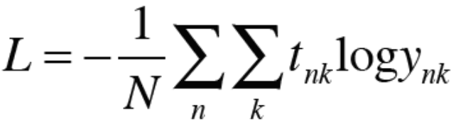 * N은 데이터의 총개수이다. $t_n$은 one-hot vector로 나타낸 정답 레이블이며, $t_nk$는 n개째 데이터의 k번째 값을 의미한다. $y_nk$는 확률분포를 나타낸다.