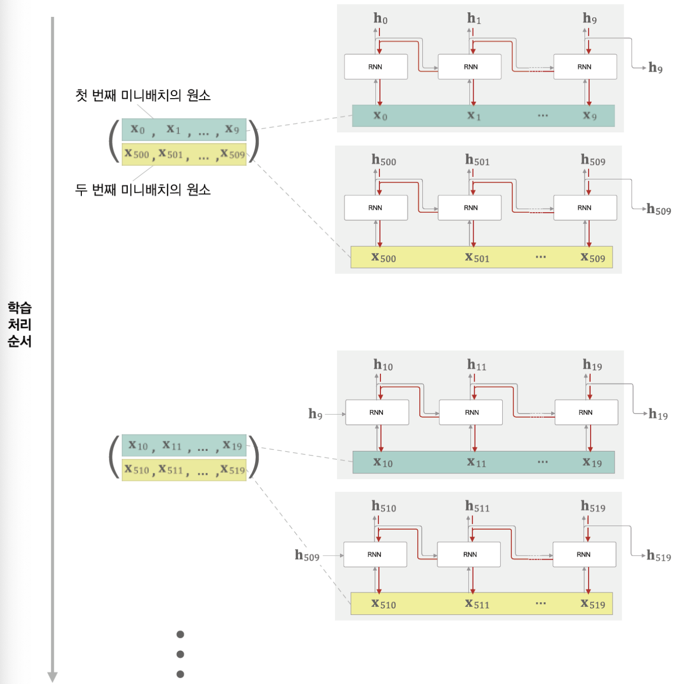* 순전파의 연결은 끊기지 않기 때문에 데이터가 순서대로 입력되어야 한다. 미니배치에서 random한 데이터를 sampling해 입력하는 것과는 다르다. 이는 추후 더 자세히 설명하겠다.
