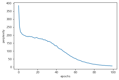* 100 epochs에 도달하면 peplexity가 1정도에 수렴하는 것을 볼 수 있다.