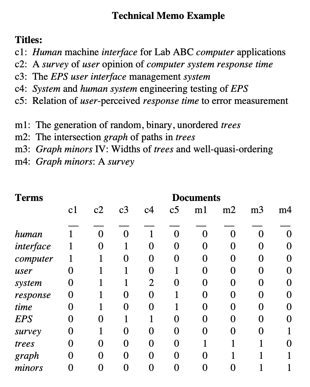 * c1~c5는 human-computer interaction에 관한 documents이고, m1~m4는 graph theroy에 대한 documents이다.