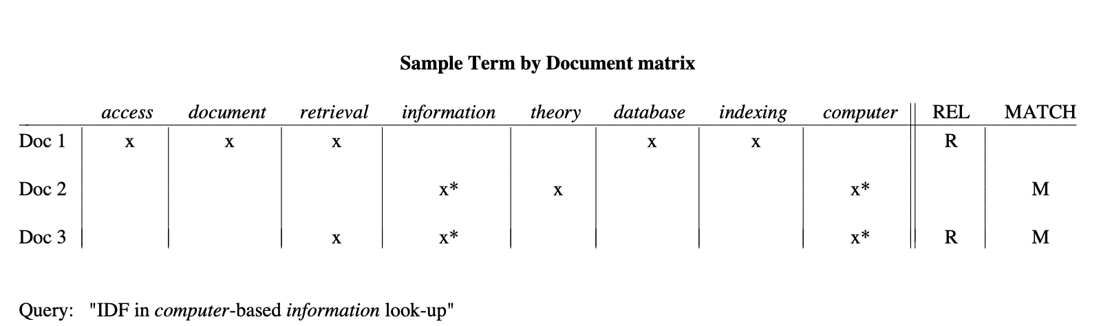 * 위 그림에서 사용자의 관점에 의하면 Doc1에 look-up이라는 단어가 들어있었어야 하고, 검색 시스템의 관점에 의하면 사용자의 query에는 access(혹은 document, retrieval 등)가 들어있어야 한다.