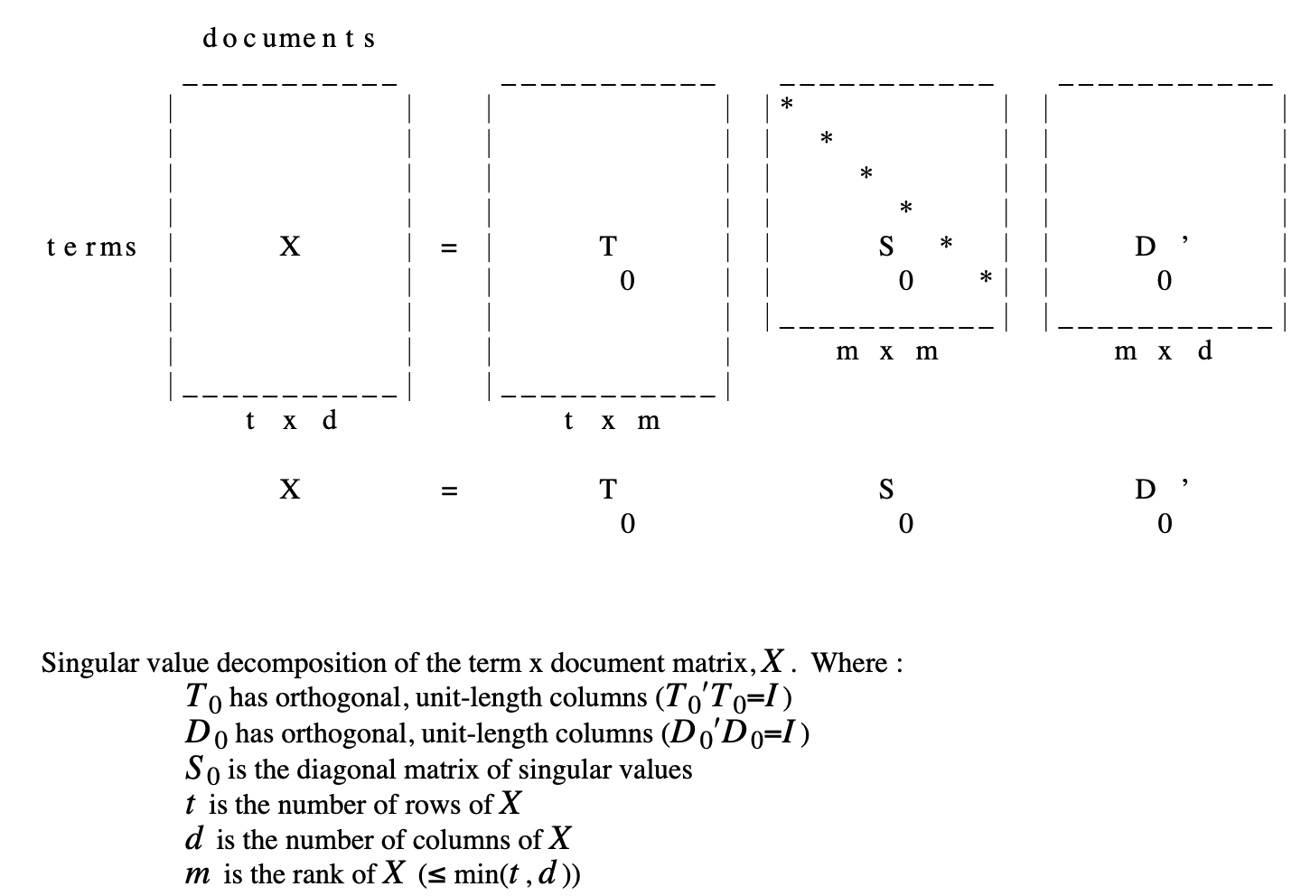 * term과 document로 이뤄진 t x d matrix X는 다음과 같이 세 개의 marix들로 분해될 수 있다.