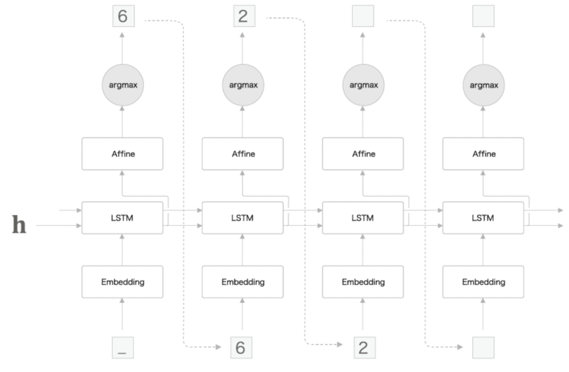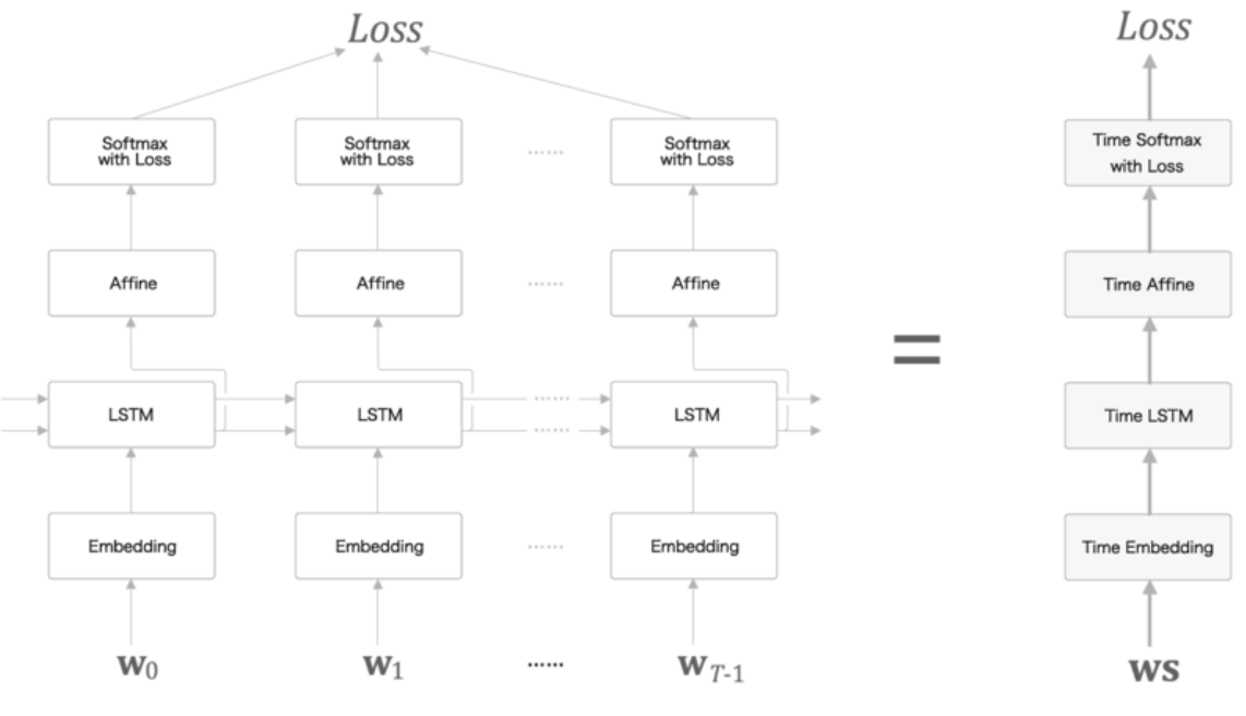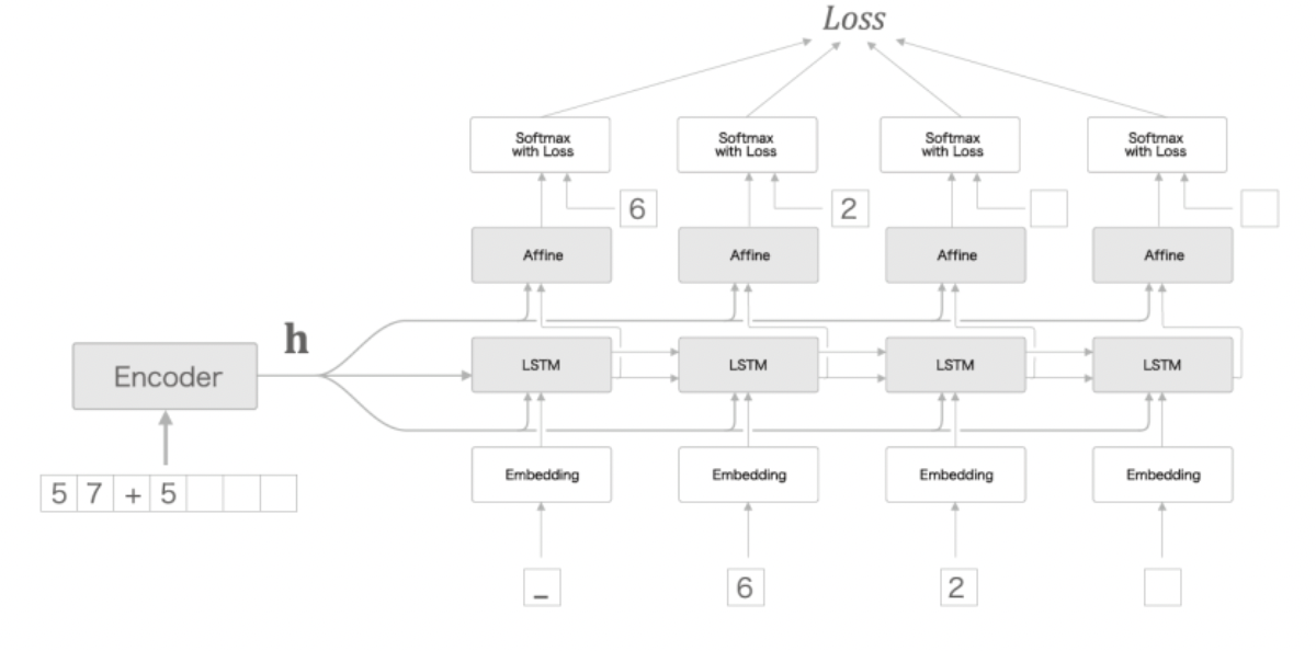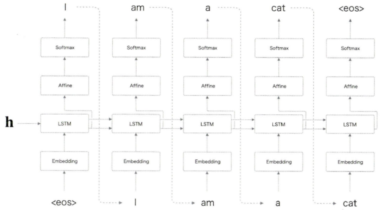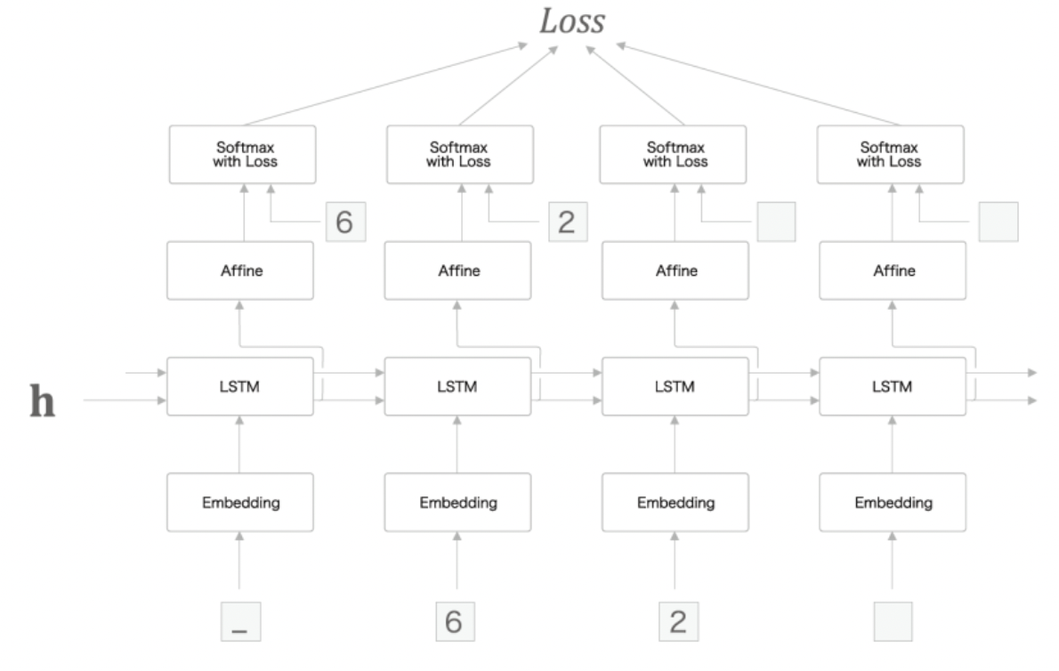 * 그런데 이렇게 되면 affine 계층에서는 encoder로 부터 전해져 온 hidden state vector h와 LSTM의 출력 vector 두 개의 vector가 입력된다. 이 때 입력은 concatenate되어 softmax with loss 계층으로 들어가게 된다.