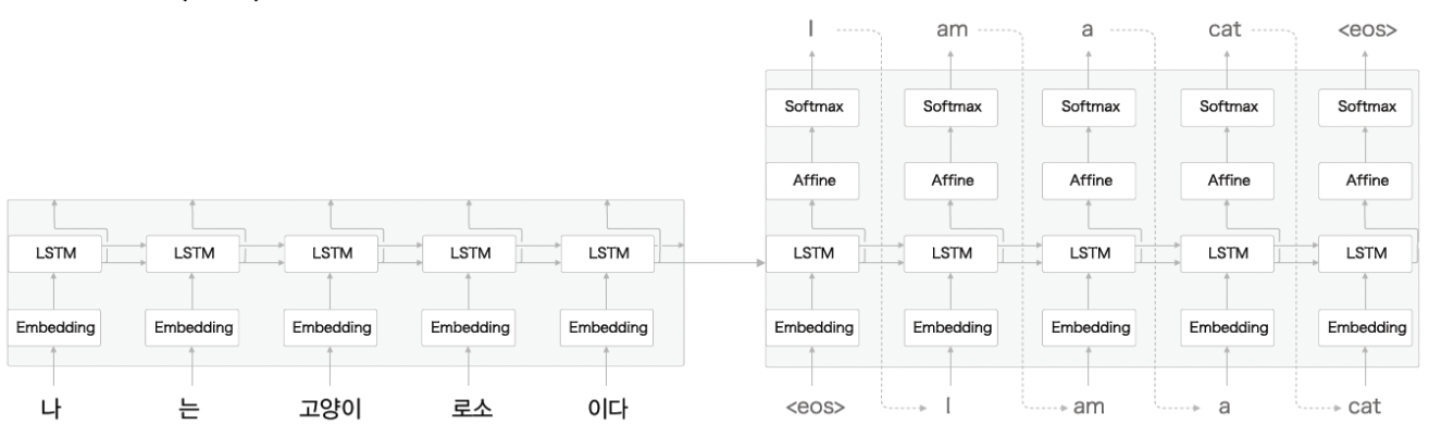 * seq2seq은 LSTM 두 개(Encoder의 LSTM과 Decoder의 LSTM)로 구성된다.