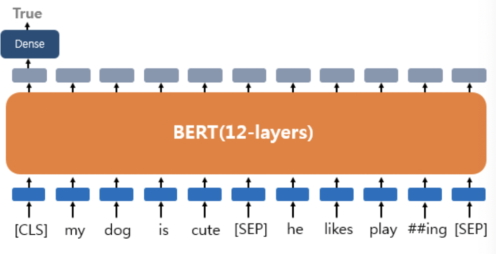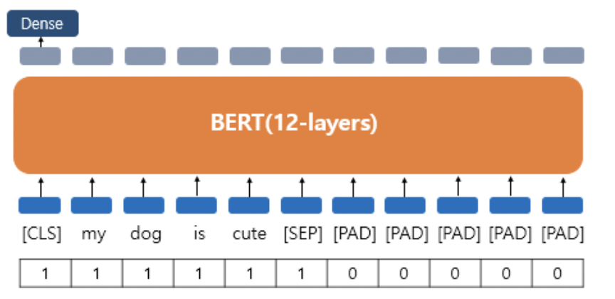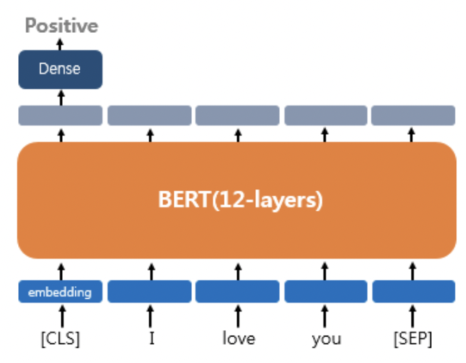 * 감성분류 등에 사용된다. [CLS] 토큰 자리에서 해당 문서의 sentiment를 분류한다. binary classification이기 때문에 dense layer를 추가할 수 있다.