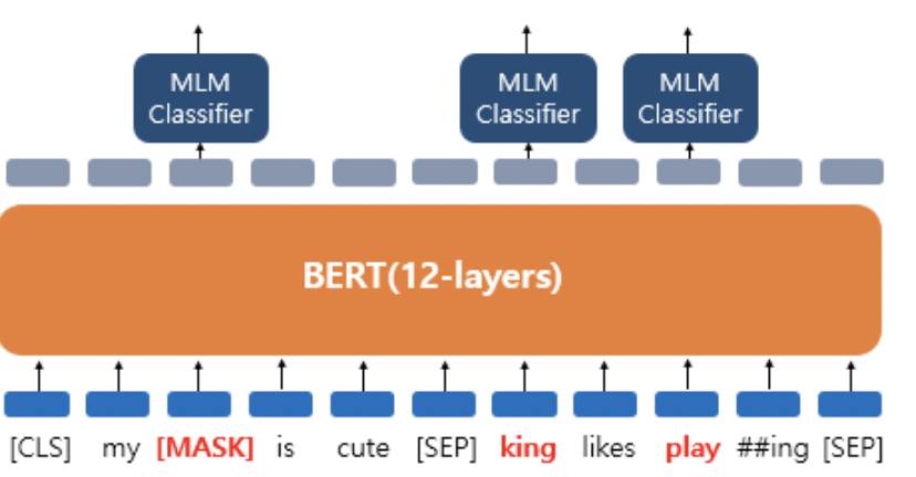 * BERT의 훈련 과정에서 손실함수에는 이 마스킹된 단어 예측에 대해서만 반영되고, 마스킹되지 않은 나머지 단어들에 대한 예측은 반영되지 않는다.