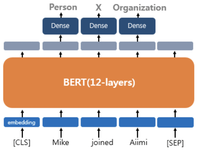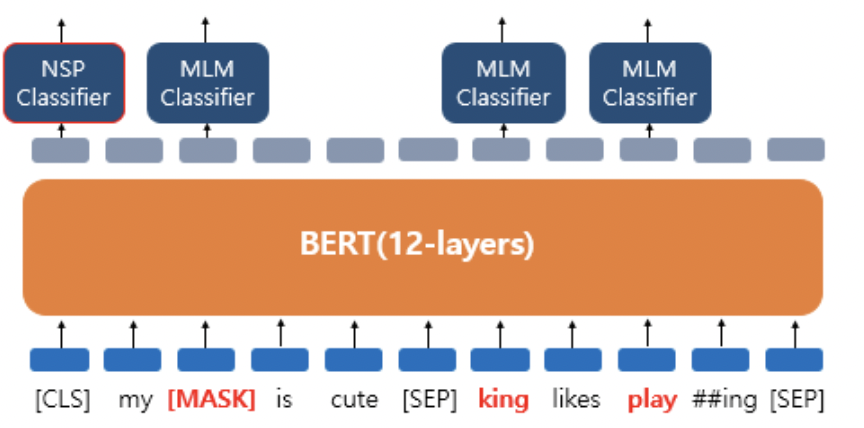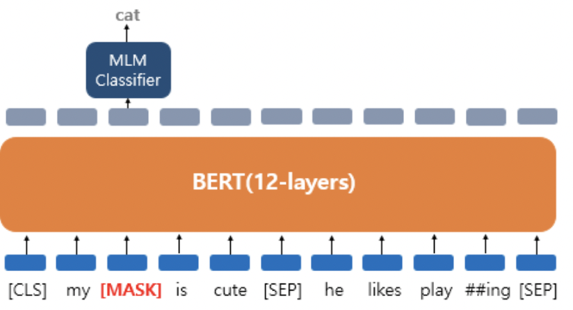 * 만약 'dog' 단어가 마스킹 되었다면, MLM classifier는 마스킹된 단어가 무엇인지를 예측한다. 이 때 Dense layer와 softmax layer를 거쳐 가장 확률이 높은 단어를 하나 뽑게 된다.