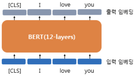 * BERT의 embedding은 문맥을 반영햔 embedding이다. 무슨 뜻이냐면 문장 내에서의 다른 단어들과의 관계를 반영한 embedding을 출력한다는 뜻이다. 이는 transformer의 encoder를 사용하기 때문이다.