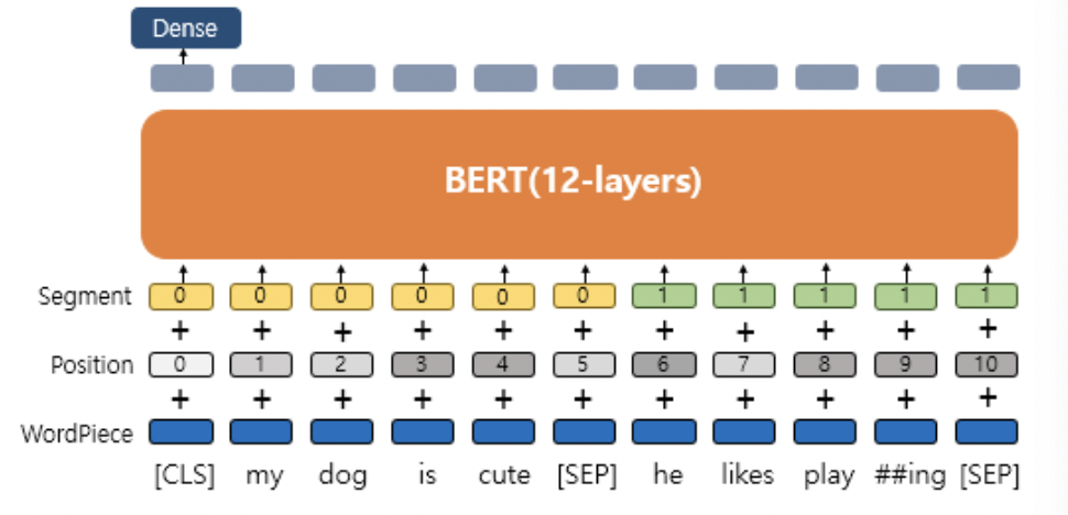 * 문장 종료시 [SEP] 토큰이 등장하며 두 개의 문장을 구분해준다(두 번째 문장 종료 이후에도 [SEP]토큰이 나온다)