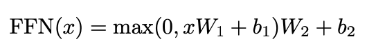 * input x, 다시 말해 Multi-head attention의 output은 위 식과 같이 두 번의 linear transformation을 거친다.