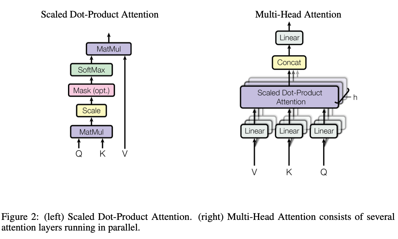 * scaled dot-product attention의 input은 $d_k$ 차원의 query, key 벡터들과 $d_v$ 차원의 value 벡터들로 이뤄져있다. 위 그림에서는 각 벡터들을 Q, K, V로 표현하였다.